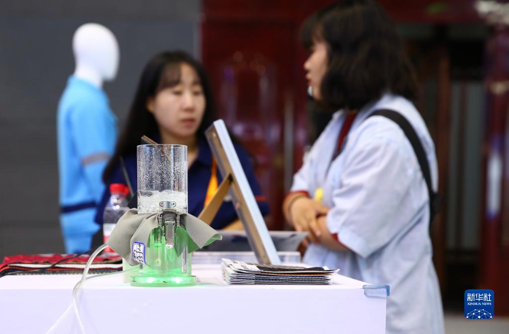 9月2日,在國家體育館舉行的服貿會環(huán)境服務專題展上,觀眾在中科海勢展臺展出的拓撲柔凝膠材料旁交流。