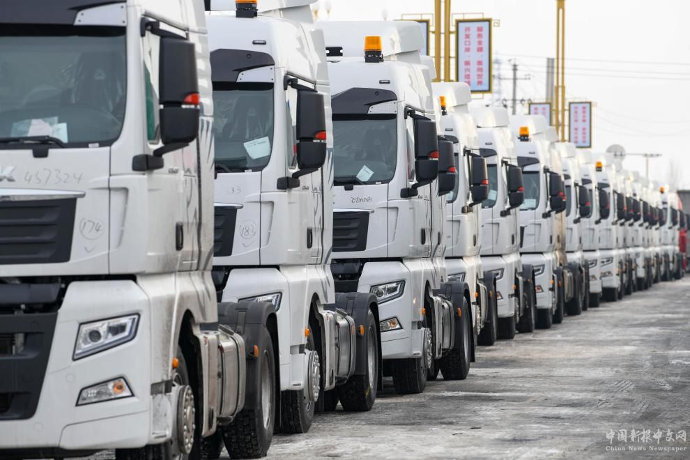 出口中亞國家的卡車在新疆巴克圖口岸等候出境(2023年2月4日攝)。新華社記者胡虎虎 攝