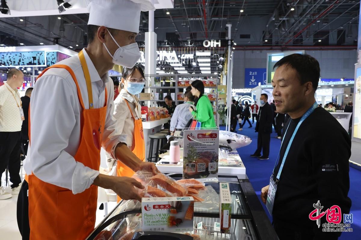 在進(jìn)博會(huì)食品展區(qū),壹叁文的經(jīng)理章程(左)告訴記者,雖然每屆進(jìn)博會(huì)他都會(huì)參加,但是這次是他們首次嘗試獨(dú)立參展,能夠在進(jìn)博會(huì)參展,對(duì)他們品牌的知名度和美譽(yù)度都是非常好的提升。他帶來(lái)的產(chǎn)品是來(lái)自南美智利巴塔哥尼亞海域的三文魚(yú),因?yàn)槿僳E罕至,水質(zhì)純凈,良好的自然環(huán)境養(yǎng)育出優(yōu)質(zhì)的的人間美味。