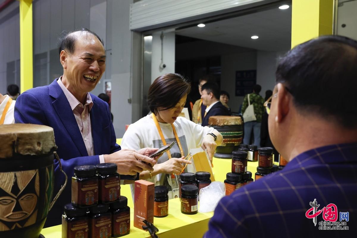 在睦朋得野生蜂蜜展臺(tái),董事長(zhǎng)張展平在熱情的推介他們從贊比亞原始森林帶來(lái)的的蜂蜜產(chǎn)品。