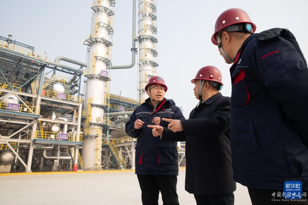12月28日,在淮北礦業(yè)集團(tuán)碳鑫科技有限公司,劉中民院士(中)和工作人員在交流裝置建設(shè)和運(yùn)行情況。