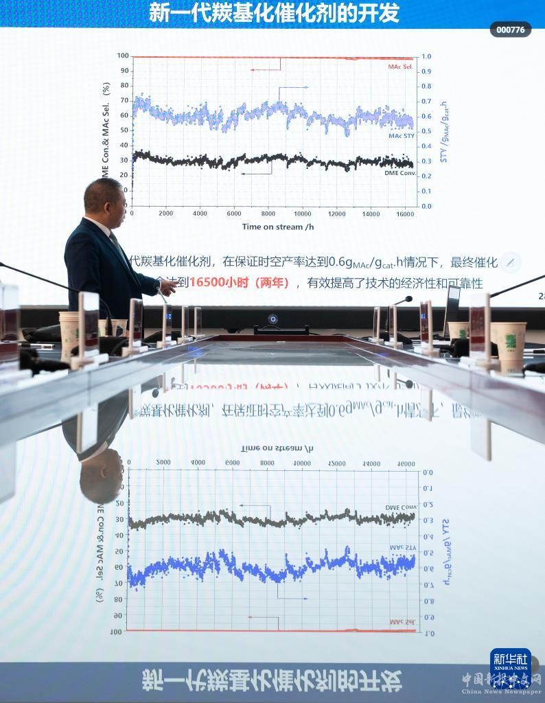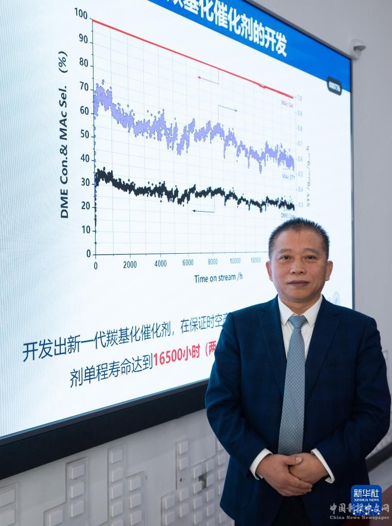 12月28日,在淮北礦業(yè)集團(tuán)碳鑫科技有限公司,劉中民院士在會(huì)議室向媒體介紹升級(jí)催化劑的研究進(jìn)展。