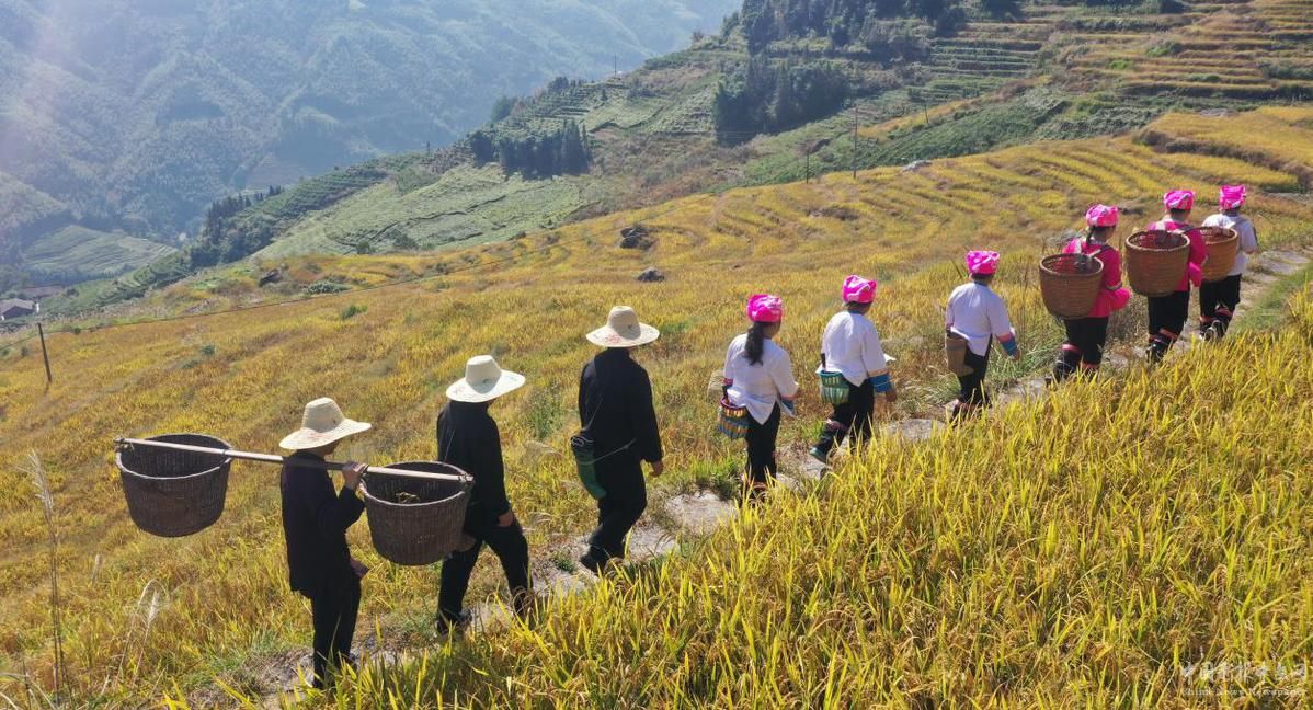 連日來,廣西桂林市龍勝各族自治縣龍脊梯田的水稻進(jìn)入收獲期,村民們搶抓晴好天氣,進(jìn)行收割、脫粒、搬運(yùn)、晾曬。