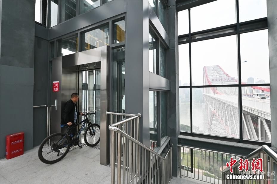 11月2日,市民乘坐重慶市朝天門長江大橋垂直升降梯出行。垂直升降梯位于朝天門大橋兩側橋頭,共四部,近日已投入試運行,投運后可解決大橋橋面與橋下道路的垂直高差問題,方便民眾出行。中新社記者 何蓬磊 攝