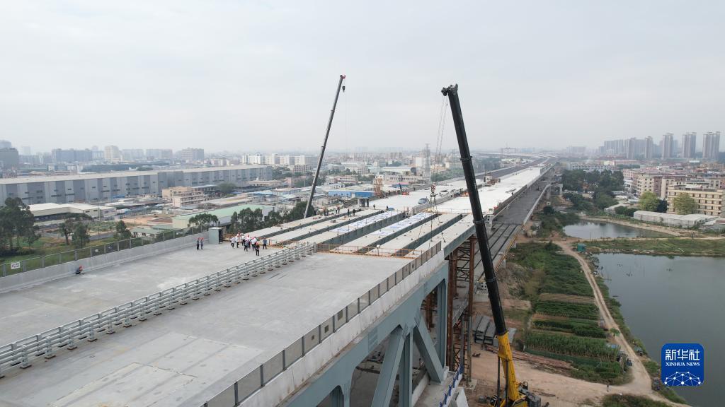 11月10日,莞番高速公路最后一段鋼箱梁吊裝完成(無人機(jī)照片)。