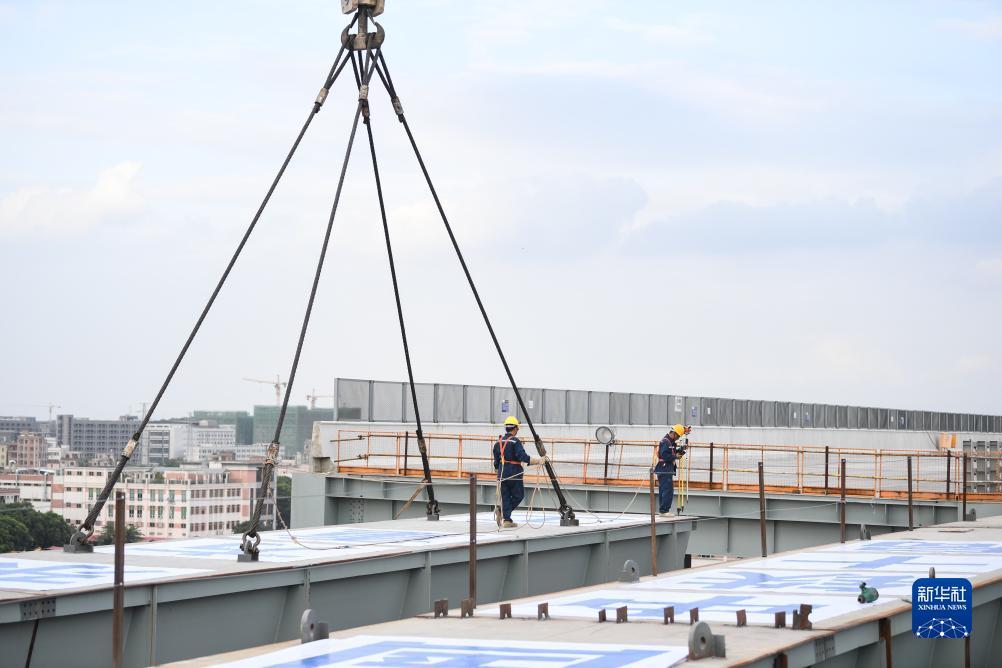 11月9日,工作人員在莞番高速吊裝的鋼箱梁上測量作業(yè)。