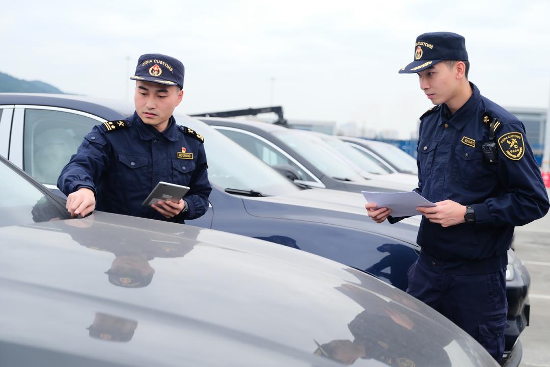 海關(guān)的工作人員正在對車輛進(jìn)行檢查。