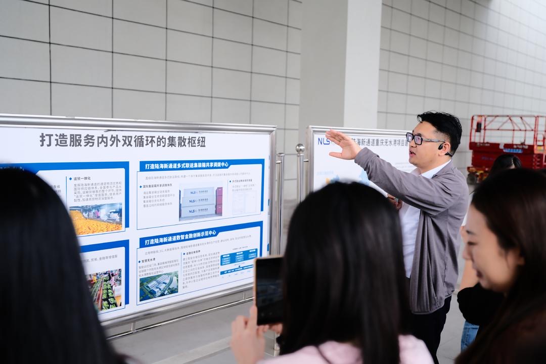 工作人員給采訪團(tuán)介紹陸海新通道無水港的具體情況。