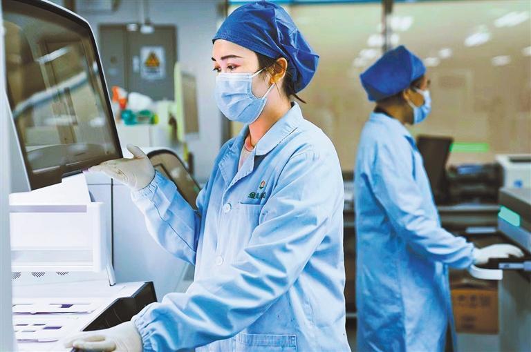 金域醫(yī)學(xué)工作人員正在做相關(guān)實(shí)驗(yàn)。金域醫(yī)學(xué)探索生物技術(shù)與新一代信息技術(shù)融合創(chuàng)新,進(jìn)一步解決臨床診斷難題。