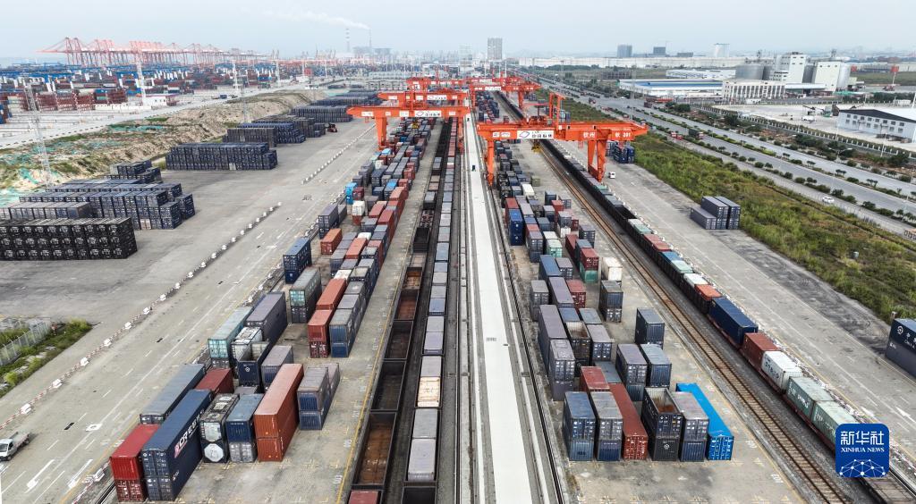 火車在欽州港碼頭裝運(yùn)集裝箱(11月12日攝,無(wú)人機(jī)照片)。