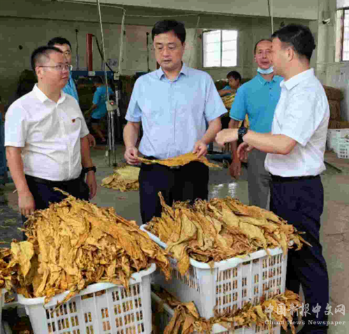 嘉禾縣縣委書記黃仲(中)深入普滿鄉(xiāng)煙草站煙葉收購(gòu)點(diǎn)調(diào)研煙葉收購(gòu)工作。