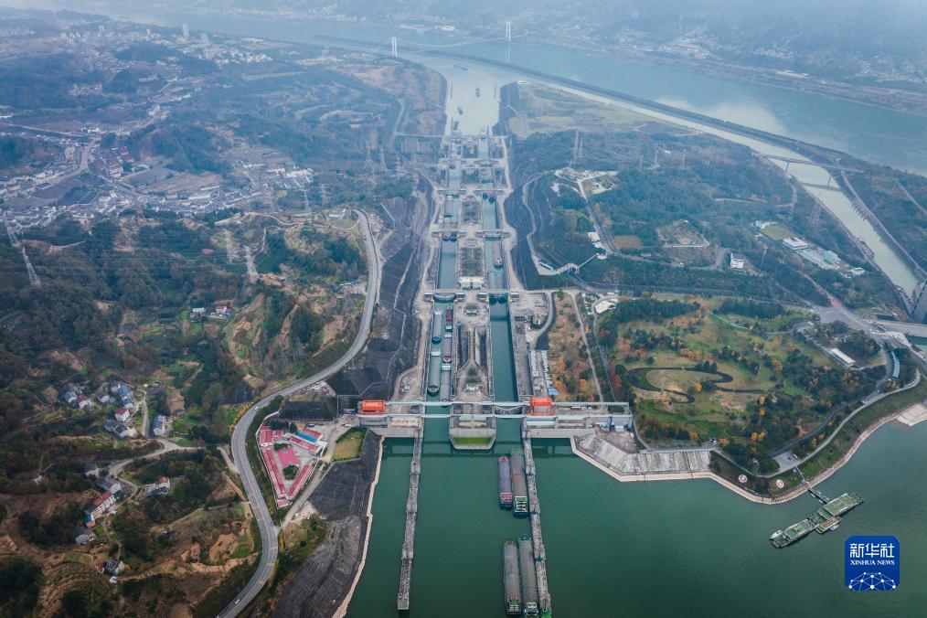 12月1日,船舶有序通過(guò)三峽雙線(xiàn)五級(jí)船閘(無(wú)人機(jī)照片)。截至11月25日,三峽船閘2023年過(guò)閘貨運(yùn)量超1.56億噸,突破2022年全年貨運(yùn)量歷史最高紀(jì)錄。今年以來(lái),三峽船閘共運(yùn)行10210閘次,過(guò)船39463艘次,通過(guò)旅客16939人次。自2003年通航以來(lái),三峽船閘已安全高效運(yùn)行20年,累計(jì)過(guò)閘貨運(yùn)量19.96億噸。