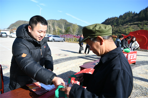 2023年12月7日,貴州省凱里市舟溪鎮(zhèn)曼洞村,執(zhí)法人員在發(fā)放相關(guān)法律知識宣傳資料。(楊仁海 攝)