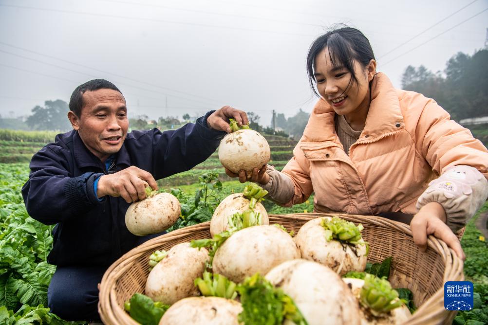 12月12日,在重慶市綦江區(qū)趕水鎮(zhèn)石房村趕水蘿卜種植園內(nèi),種植戶在田地里收獲蘿卜。