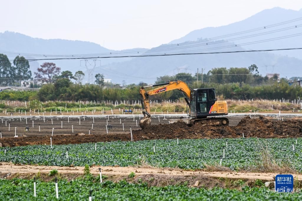 在廣西鐘山縣一處供港澳蔬菜基地,工人操作挖掘機整修田壟(12月5日攝)。