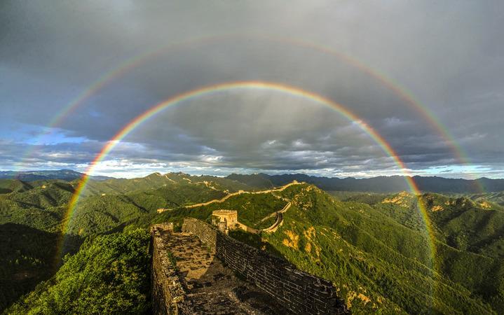 彩虹下的金山嶺長(zhǎng)城(2015年6月11日攝)。新華社發(fā)(段久軍攝)