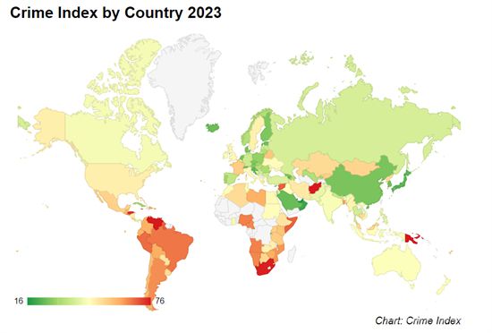 Numbeo數(shù)據(jù)指出,犯罪指數(shù)低于20的國家屬犯罪率極低,高于80則屬極高。香港犯罪指數(shù)為21.5,而排名第1的委內(nèi)瑞拉犯罪指數(shù)高達82.6,其次是巴布亞新幾內(nèi)亞的79.9和阿富汗的78.6。