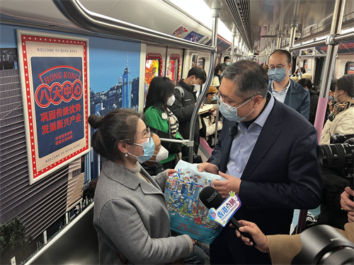 駐武漢辦郭偉勛主任今日現(xiàn)身不同車廂,與乘客交流互動,分享香港的最新發(fā)展及派發(fā)紀念品,邀請他們一起了解今日的香港,除了到香港觀光旅游,還可以把握機遇,到香港拓展事業(yè)。