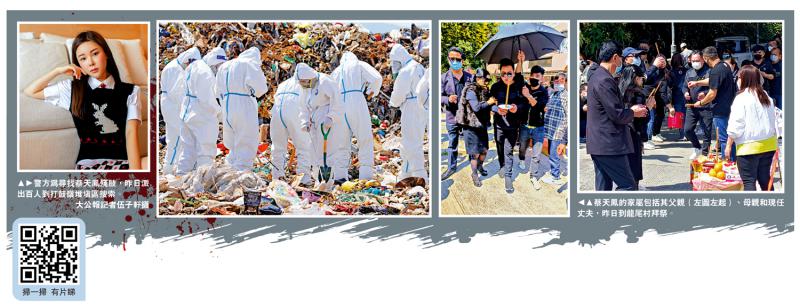 譚仔米線創(chuàng)辦人的媳婦、28歲名媛蔡天鳳(Abby Choi)遭殺害肢解烹尸案,警方昨日在打鼓嶺堆填區(qū)嘗試搜索死者殘肢。警方已鎖定范圍,有信心載有證物的垃圾就在搜索范圍內(nèi),預(yù)計搜索需時至少2至3日。