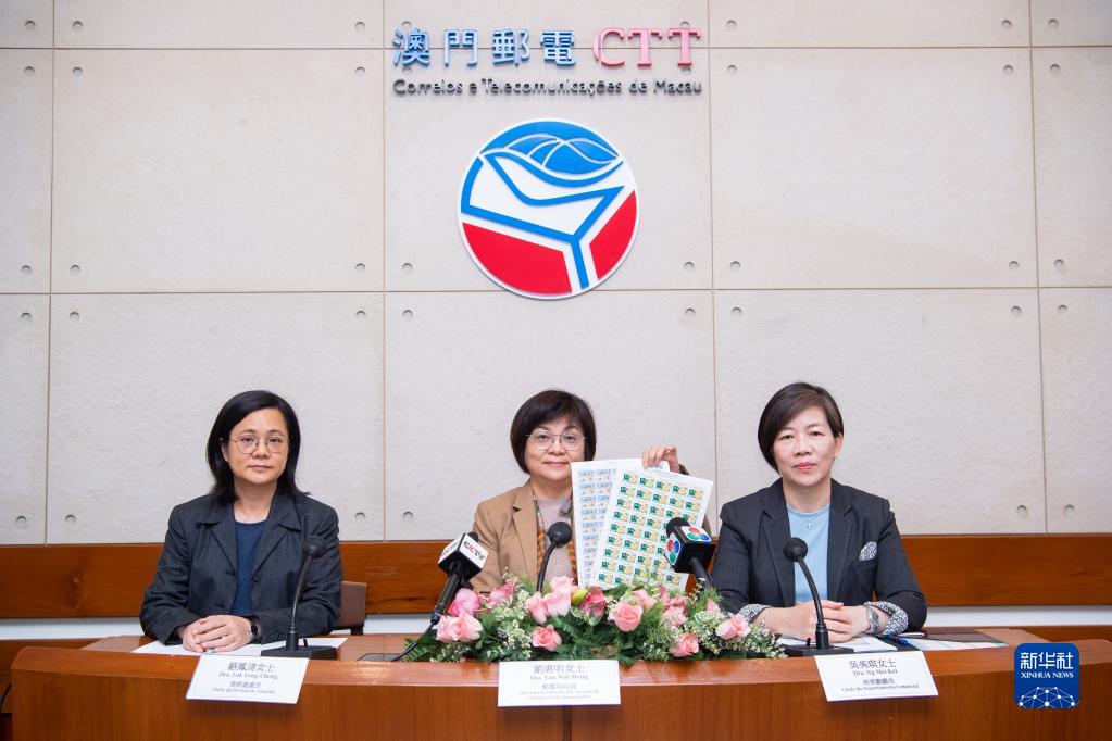 3月30日,澳門郵電局局長劉惠明(中)在新聞發(fā)布會上展示“澳門基本法頒布三十周年”郵品。