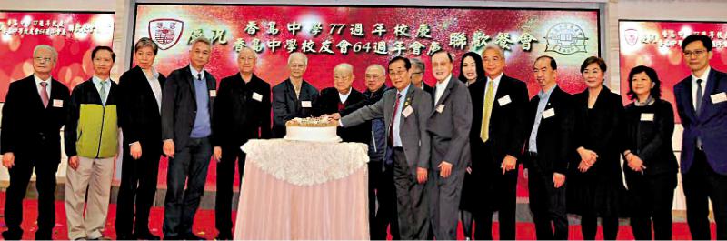 圖:葉燕平校監(jiān)(左六)、各校董及一眾嘉賓一同切生日蛋糕共慶香島中學(xué)第77周年校慶。