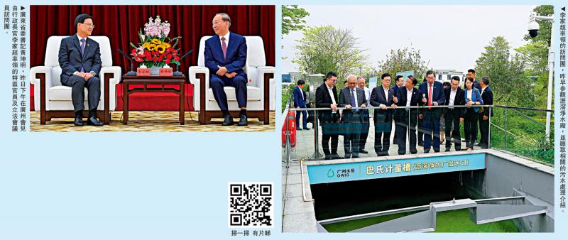 左圖:廣東省委書記黃坤明,昨日下午在廣州會(huì)見由行政長官李家超率領(lǐng)的特區(qū)官員及立法會(huì)議員訪問團(tuán)。右圖:李家超率領(lǐng)的訪問團(tuán),昨早參觀瀝滘淨(jìng)水廠,并聽取相關(guān)的污水處理介紹。