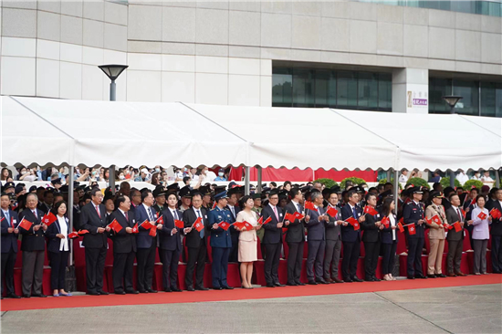 學生在升旗禮上揮舞國旗和區(qū)旗。(大公文匯全媒體記者麥鈞杰攝)