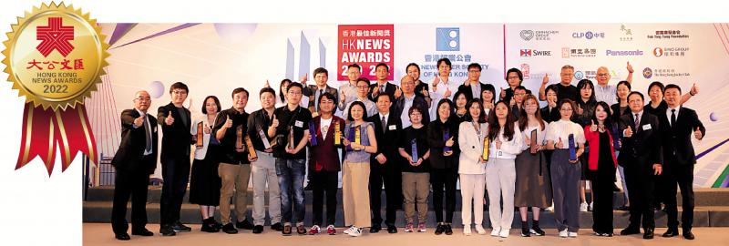 圖:香港報(bào)業(yè)公會(huì)昨日舉行“2022年香港最佳新聞獎(jiǎng)”頒獎(jiǎng)典禮,大公文匯傳媒集團(tuán)勇奪15個(gè)獎(jiǎng)項(xiàng),獎(jiǎng)項(xiàng)數(shù)量蟬聯(lián)全港報(bào)業(yè)集團(tuán)之首。圖為得獎(jiǎng)?wù)叽蠛险铡?/p>