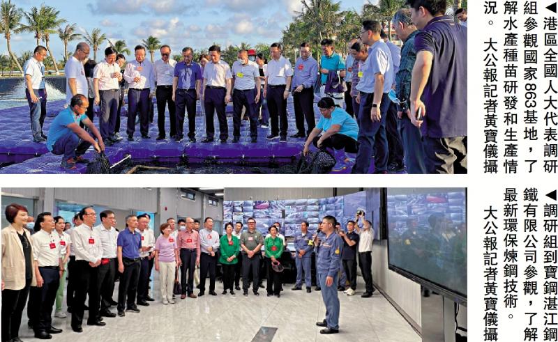 上圖:港區(qū)全國人大代表調(diào)研組參觀國家863基地,了解水產(chǎn)種苗研發(fā)和生產(chǎn)情況。下圖:調(diào)研組到寶鋼湛江鋼鐵有限公司參觀,了解最新環(huán)保煉鋼技術(shù)。\大公報記者黃寶儀攝