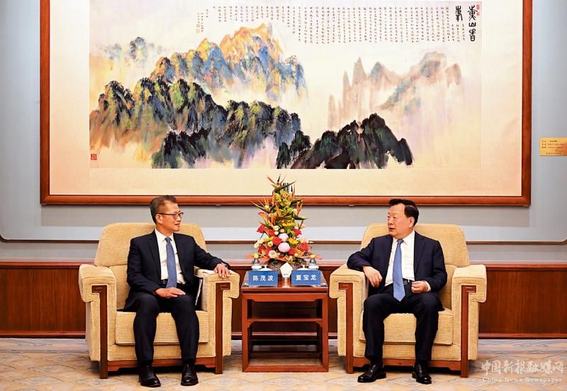 圖:7月12日,國(guó)務(wù)院港澳事務(wù)辦公室主任夏寶龍?jiān)诒本?huì)見(jiàn)香港特區(qū)政府財(cái)政司司長(zhǎng)陳茂波。