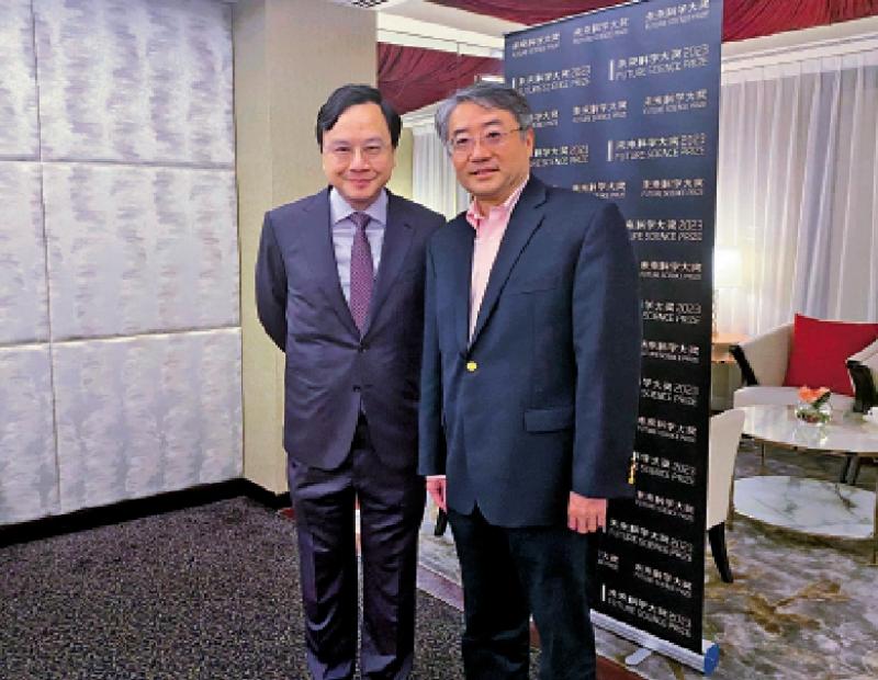 圖:盧煜明(左)認(rèn)為,目前是將大型科創(chuàng)盛事移師來港的良好時機。右為未來科學(xué)大獎捐贈人代表王強。