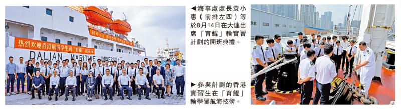 左圖:海事處處長袁小惠(前排左四)等于8月14日在大連出席“育鯤”輪實(shí)習(xí)計(jì)劃的開班典禮。右圖:參與計(jì)劃的香港實(shí)習(xí)生在“育鯤”輪學(xué)習(xí)航海技術(shù)。