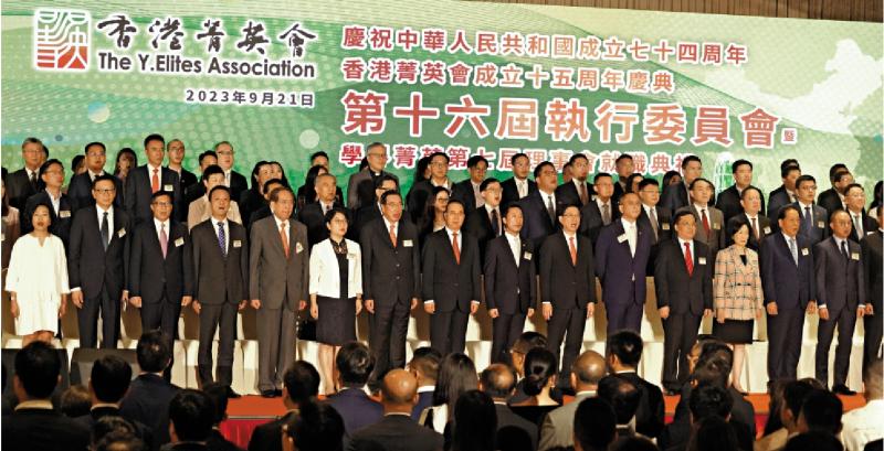圖:香港菁英會(huì)成立15周年慶典,第十六屆執(zhí)行委員會(huì)暨學(xué)界菁英第七屆理事會(huì)昨日舉行就職典禮。