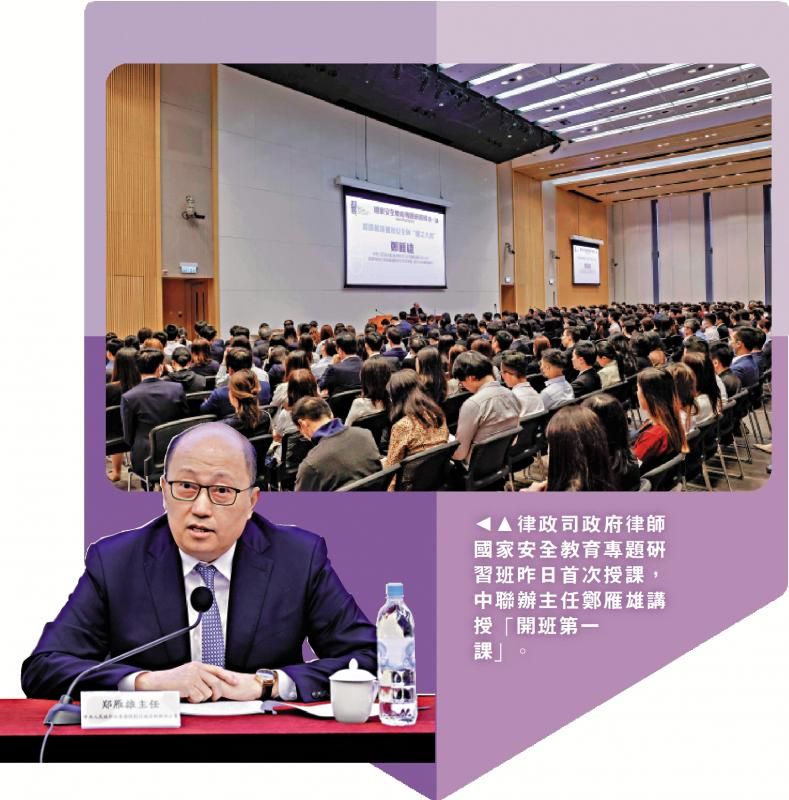 圖:律政司政府律師國(guó)家安全教育專(zhuān)題研習(xí)班昨日首次授課,中聯(lián)辦主任鄭雁雄講授“開(kāi)班第一課”。