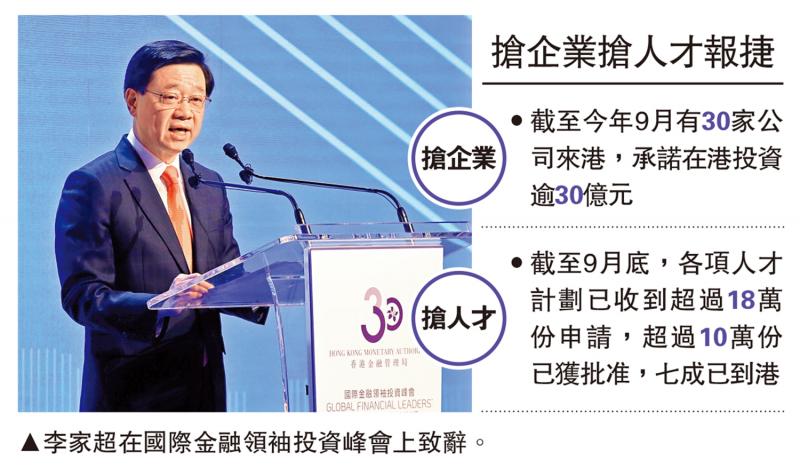 財政司司長陳茂波表示,自去年10月起特區(qū)政府推出兩大策略性業(yè)務,吸引企業(yè)來港發(fā)展、吸引人才來港。截至今年9月已有30家公司來港,承諾在港投資逾30億元。
