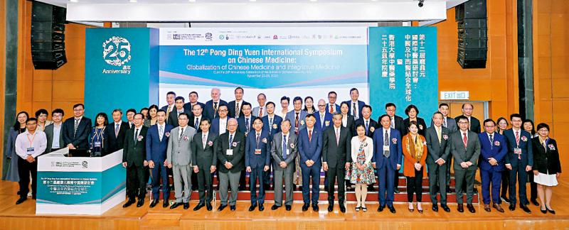 圖:“第12屆龐鼎元國際中醫(yī)藥研討會”暨港大中醫(yī)藥學院25周年院慶舉行,一眾嘉賓在臺上合照。