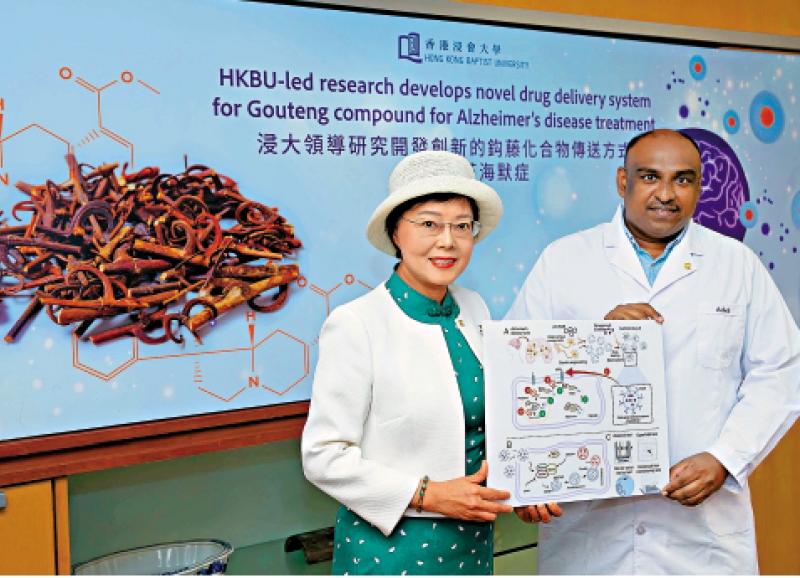 圖:浸大中醫(yī)藥學院副院長(教與學)李敏教授(左)、研究助理教授Ashok Iyaswamy博士(右)開發(fā)創(chuàng)新的鉤藤化合物傳送方式治療阿茲海默癥。