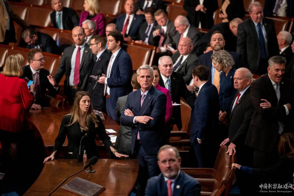 1月6日,在美國首都華盛頓,共和黨聯(lián)邦眾議員凱文·麥卡錫(中)在眾議院等待眾議長選舉表決結(jié)果。新華社記者劉杰攝