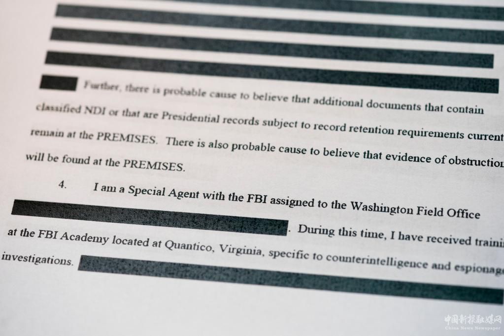 2022年8月26日,美國司法部公布聯(lián)邦調(diào)查局申請搜查前總統(tǒng)特朗普住所海湖莊園時向法院提交書面證詞的部分內(nèi)容。這份38頁的文件有大量內(nèi)容被涂黑加密。司法部解釋說,這是為了保護(hù)證人不受恐嚇或報復(fù)。新華社記者劉杰攝