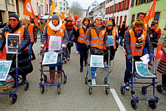 圖:示威者反對(duì)馬克龍政府提出的退休改革計(jì)劃。\美聯(lián)社
