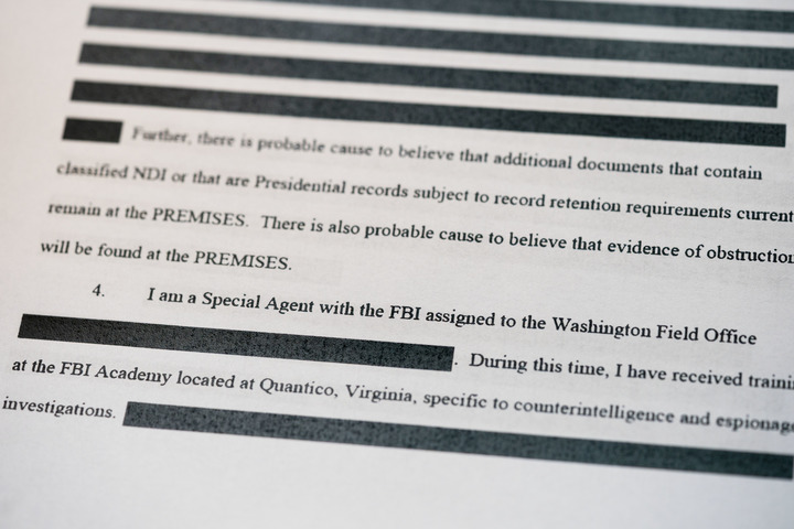 這是2022年8月26日拍攝的美國聯(lián)邦調(diào)查局申請(qǐng)搜查前總統(tǒng)特朗普住所海湖莊園時(shí)向法院提交書面證詞的部分內(nèi)容。新華社記者劉杰攝