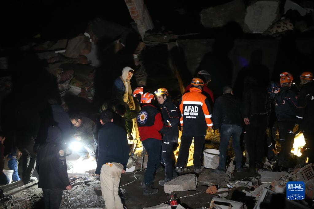 2月6日,救援人員在土耳其南部地震重災(zāi)區(qū)卡赫拉曼馬拉什省帕扎爾哲克倒塌的建筑中搜尋幸存者。