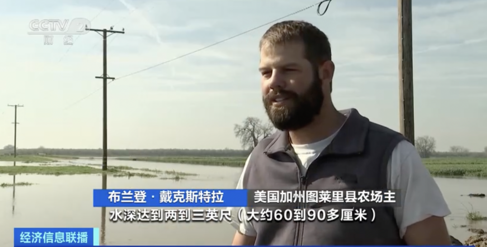 美國加州圖萊里縣農(nóng)場主 布蘭登·戴克斯特拉:你可以看到,這些農(nóng)田都完全被淹了,水深達到兩到三英尺(大約60到90多厘米),在這里本應看到的是大片農(nóng)田。我們的田地、鄰近的田地,甚至一直往西,數(shù)千英畝的農(nóng)田被淹已經(jīng)好幾天了,地里的農(nóng)作物很可能完全沒有收成了。
