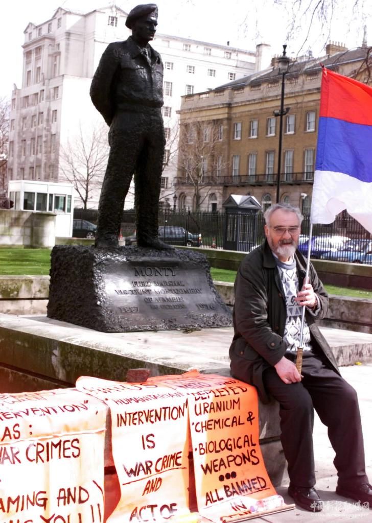 2001年4月11日,在英國(guó)倫敦首相府對(duì)面的二戰(zhàn)英軍元帥蒙哥馬利的青銅雕像前,一位南斯拉夫老人手舉南斯拉夫國(guó)旗,抗議以美國(guó)為首的北約轟炸南聯(lián)盟,并在轟炸中使用貧鈾彈,給當(dāng)?shù)卦斐蓢?yán)重環(huán)境污染。新華社記者侯少華攝