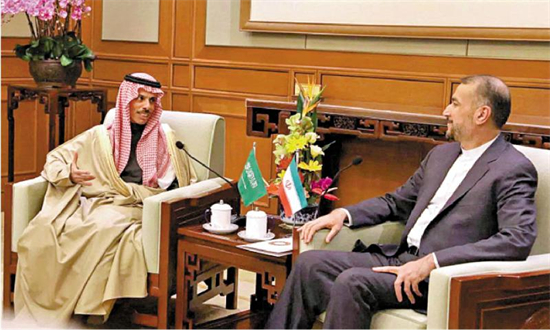 圖:4月6日,沙特外交大臣費(fèi)薩爾(左)與伊朗外長(zhǎng)阿卜杜拉希揚(yáng)在北京會(huì)面。/路透社