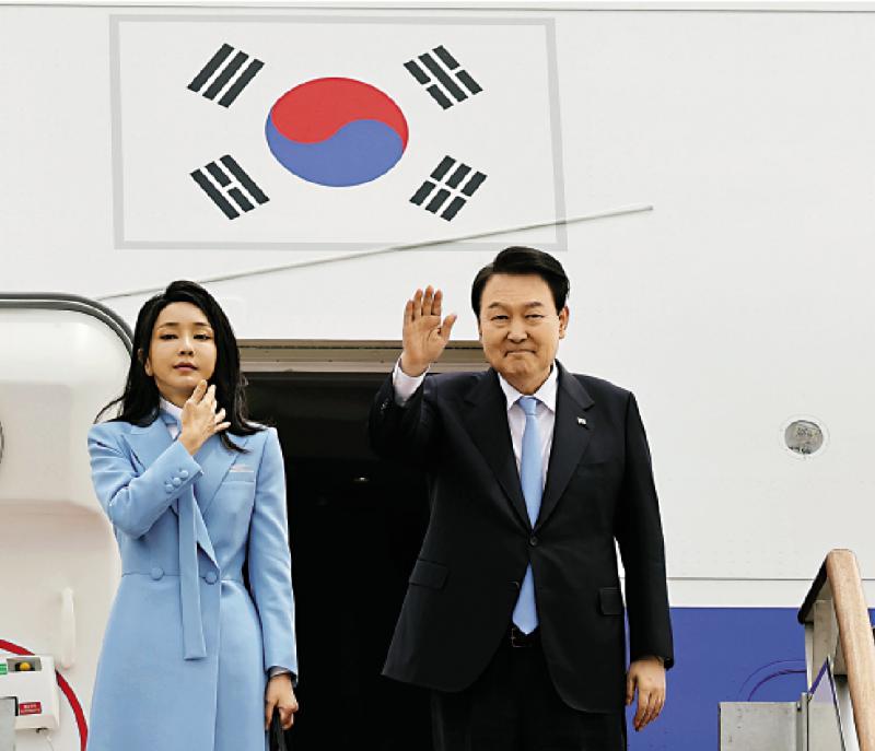 圖:尹錫悅夫婦24日登上前往美國的飛機。\美聯(lián)社