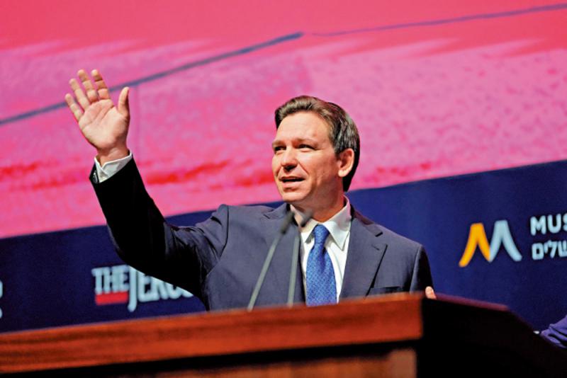 圖:佛羅里達州州長德桑蒂斯27日在耶路撒冷寬容博物館的會議上發(fā)言。\法新社