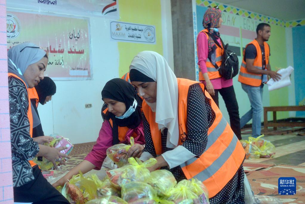 5月2日,在埃及南部阿斯旺省,工作人員為逃離蘇丹進(jìn)入埃及的難民準(zhǔn)備救濟(jì)包裹(手機(jī)拍攝)。