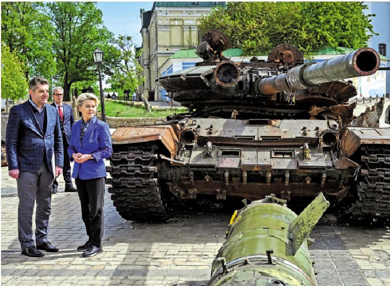 圖:歐盟委員會(huì)主席馮德萊恩(左二)9日到訪基輔。\路透社