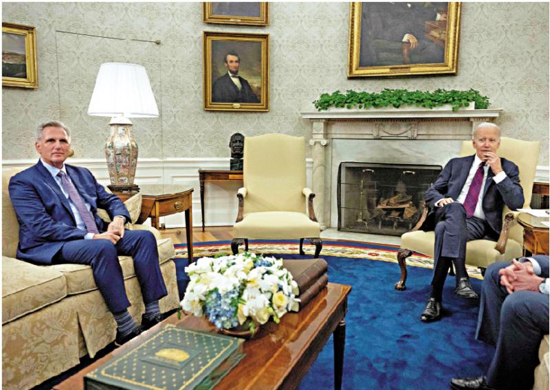 圖:美國總統(tǒng)拜登9日在白宮與眾議院議長麥卡錫(左)等人就提升債務(wù)上限談判。\法新社